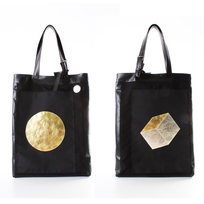 キャンパスの中に月や幾何学柄が並び箔押しされた輝きの強い牛革で